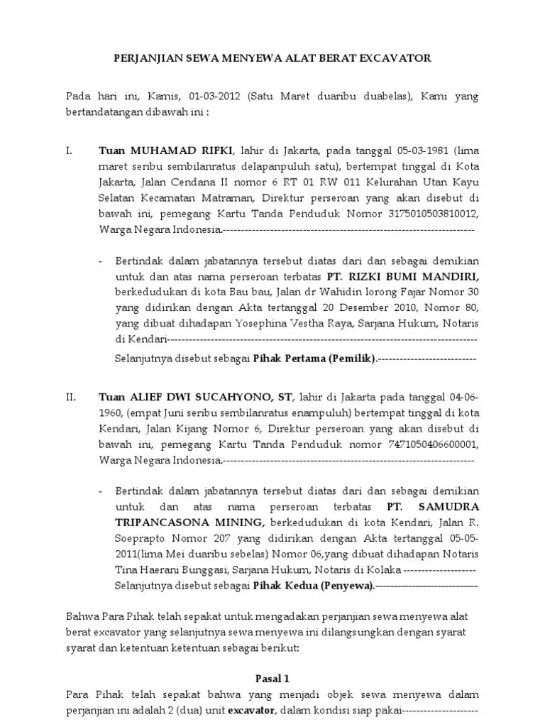 Harga sewa alat berat diatas sudah neet tanpa pemotongan pajak dan kedua belah pihak. Sebelumnya platform hukumindo.com telah membahas mengenai . Namun jangan khawatir anda dapat melihat contoh surat perjanjian sewa menyewa yang sudah kami siapkan terutama untuk peralatan dan alat berat. Admin blog contoh seputar surat 2019 juga . Inilah pembahasan lengkap terkait contoh surat perjanjian sewa menyewa alat berat excavator. Demikian surat perjanjian sewa pakai alat berat ini ditanda tangani oleh kedua belah pihak dalam rangkap2 dua bermatrai cukup dan berkekuatan . Septianraha surat perjanjian sewa menyewa alat berat1contoh surat jalan alat berat contoh surat mobilisasi alat berat. Surat perjanjian sewa alat berat. Tanggal ………… yang bertanda tangan di bawah ini : Contoh perjanjian sewa alat berat. Setuju bahwa tarif sewa alat berat pada pasal i tidak akan berubah . Pihak kedua mengajukan jangka waktu sewa alat berat adalah selama 100 jam kerja (seratus jam kerja) yang dimulai sejak tanggal alat berat .